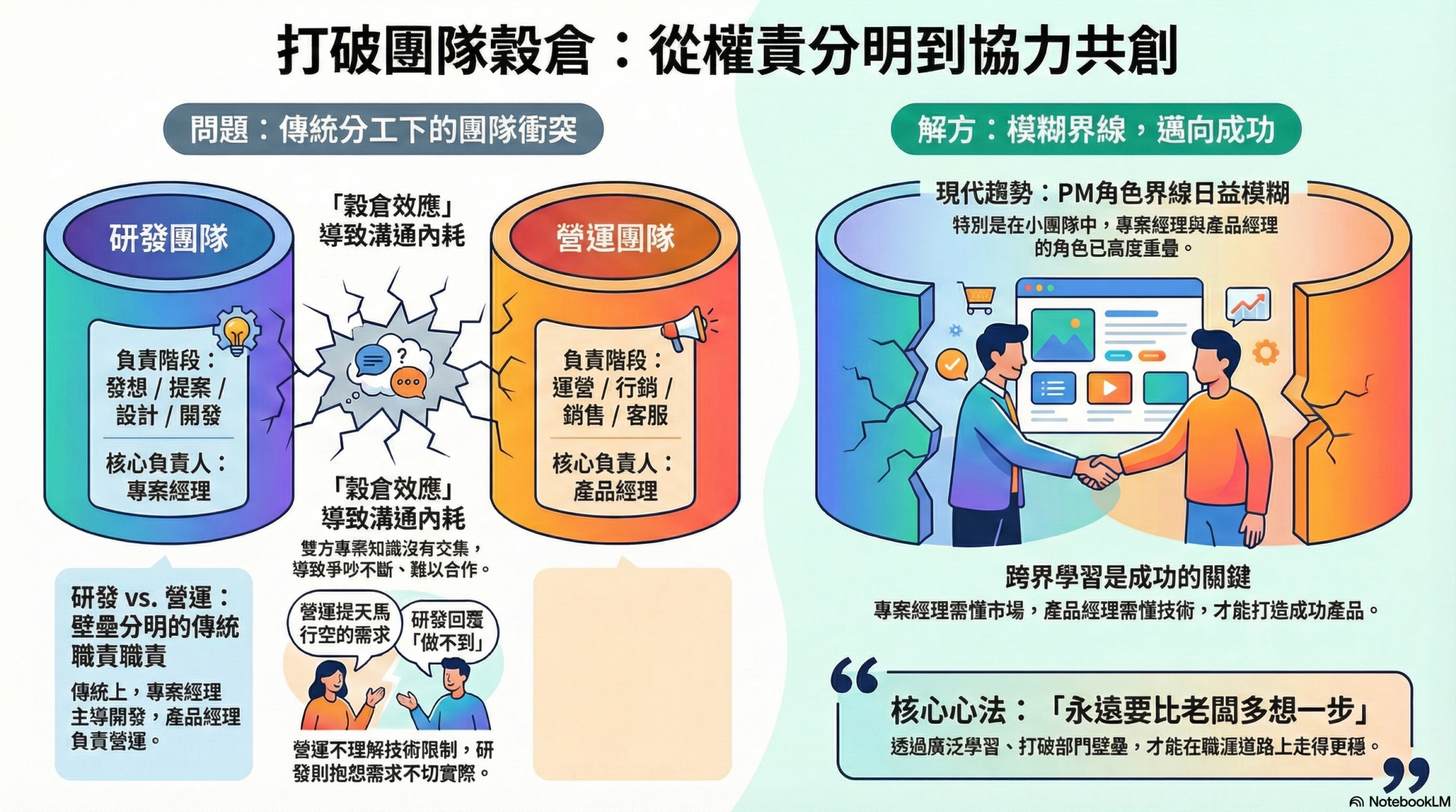 但是在現在團隊規模越來越小的環境,其實已經沒辦法切分的越來越清楚了,因為真正第一線接觸市場的是產品經理,專案經理並不完全站在前線作戰,所以專案經理要如何明白市場現在需要的、目前的市場缺口,或是具有顛覆市場的前瞻性產品?而產品經理,即便有洞悉市場的能力,要如何讓研發同仁相信他的眼光是獨到的,有機會的,是可以做出來的?