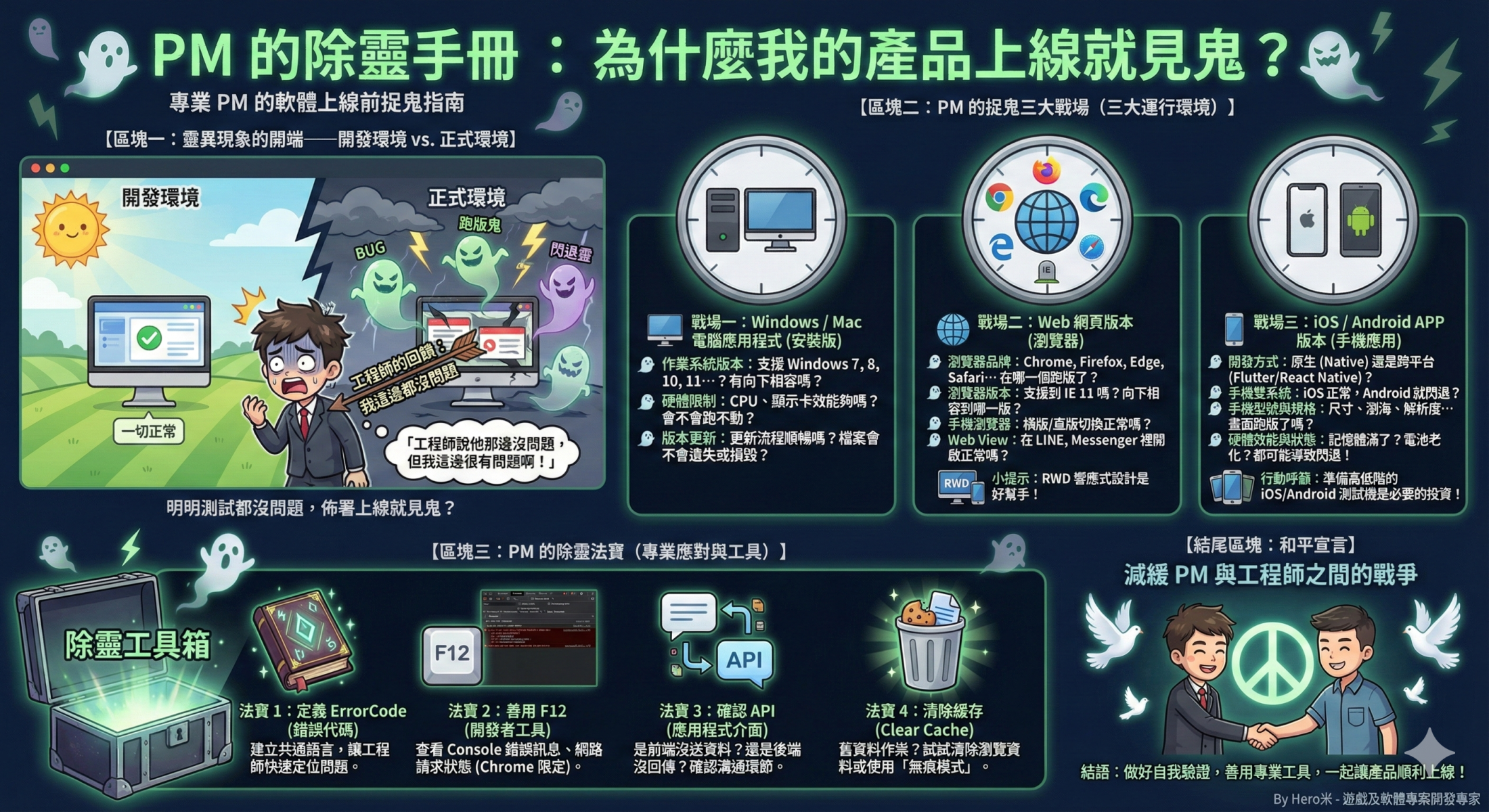 當一個版本要結束的時候,PM總是要做最後的驗收,才能提交到客戶手上,但是這個時候往往會發生一些靈異現象,為什麼這麼說呢?因為在軟體開發業都會知道一種狀況,就是明明在測試環境驗證時,都沒問題,但是一旦佈署到正式環境時,各種BUG、頁面顯示不正常、操作不如預期,通通都會發生。這時候最常收到的回饋「可能是你的問題喔,我這邊都沒問題」,一次、兩次或許可以忍住,但是時間一久肯定會氣到不行。