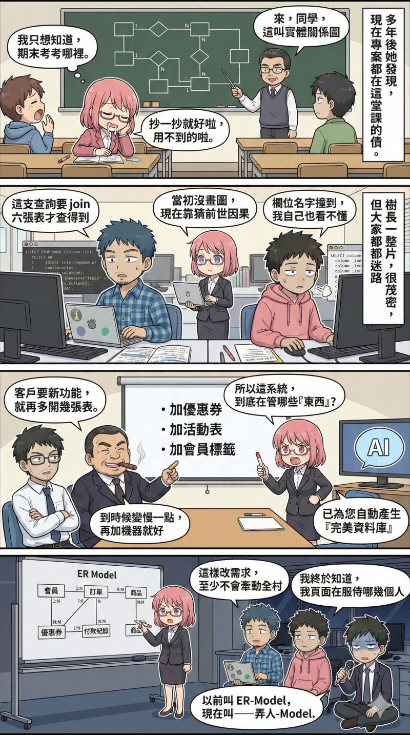 於是流程圖有了、框線圖有了、循序圖有了、實體關係圖也有了