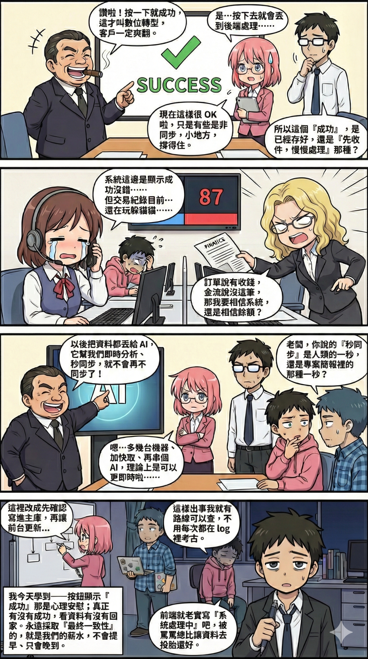 就採用「最終一致性 (Eventual Consistency)」的設計,