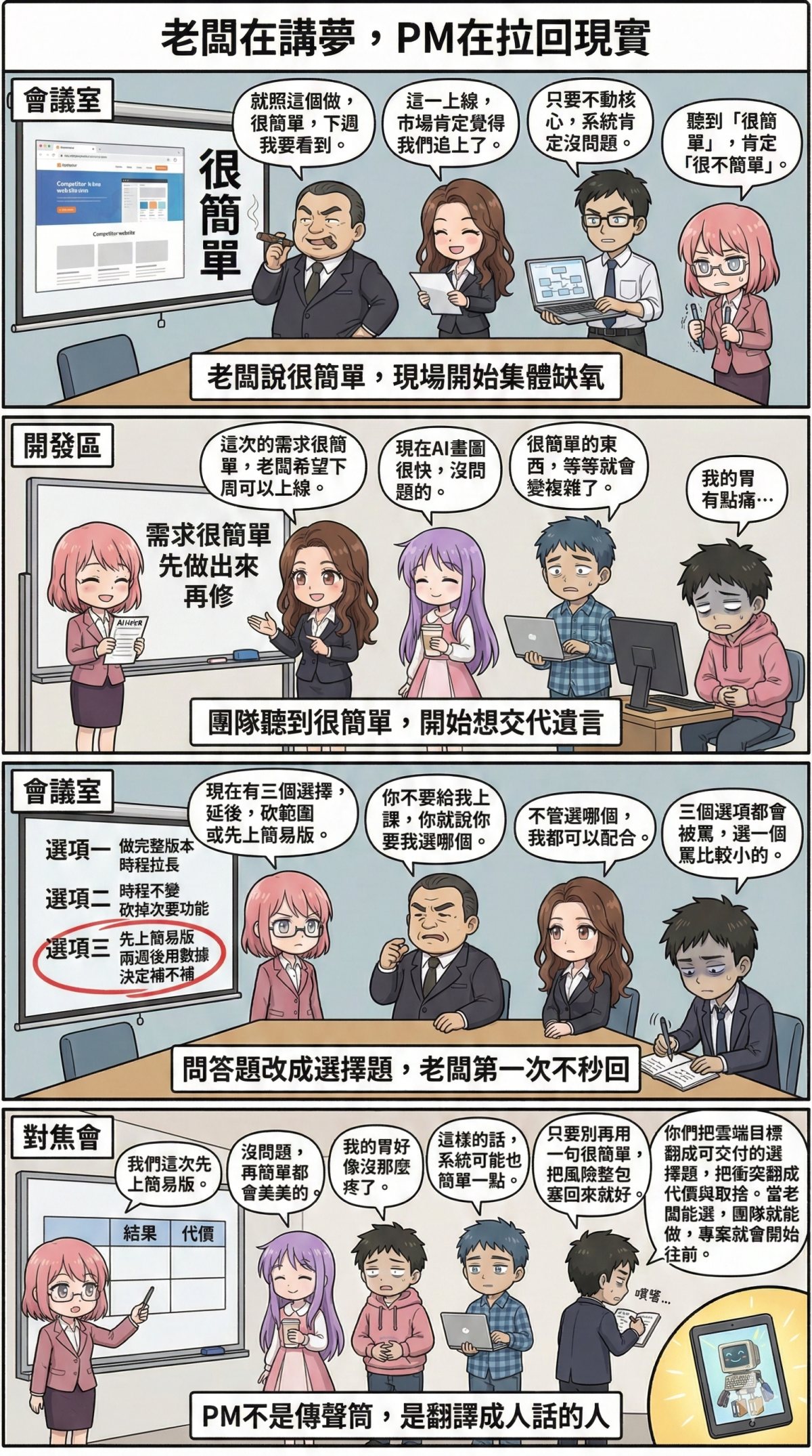 AI 可以幫你整理會議紀錄、生成簡報、預估工時,甚至幫你草擬出回報老闆的文字。但真正站在中間、幫兩邊翻譯現實與期待、把選擇說清楚的人,還是得由 PM 來擔任。
